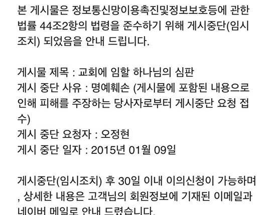 오 목사에 의해 게시물을 차단당한 네티즌은 “오 목사가 계속 법원에서 불리한 결정을 받으니 궁지에 몰려 이러는 것 같다”고 꼬집었다.