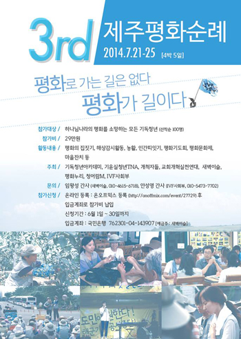 이번 행사는 제주 4.3 유적지 탐방, 평화의 집짓기, 강정마을 여름농활, 평화의 인간 띠 잇기, 강정평화기도회 및 문화제 등의 여러 가지 평화 활동으로 진행될 것이다. 애초 이 순례는 4.3사건의 상처를 고스란히 간직하고 있는 제주도에 해군기지가 건설되는 것에 대한 반대 집회의 성격을 띠었으나 이제는 우리 사회의 첨예한 갈등 현장 속에 평화를 심기 위해서 젊은이들에게 평화에 관해 깊게 성찰하며 고민해볼 기회를 제공하려는 목적이 강하다.