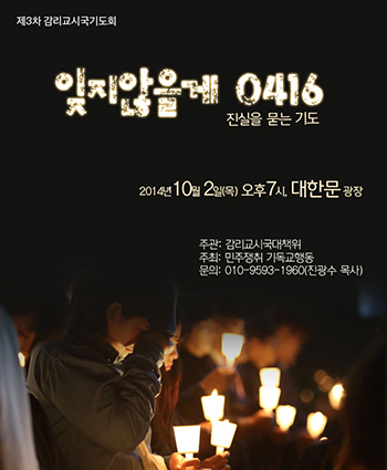 기독교계가 세월호 참사 진상규명을 촉구하며 참사 유가족과 고통을 함께 하는 가운데 민주쟁취 기독교행동(이하 기독교행동)은 10월2일(목) 오후 7시 서울 대한문 광장에서 <제3차 감리교 시국기도회>를 연다.