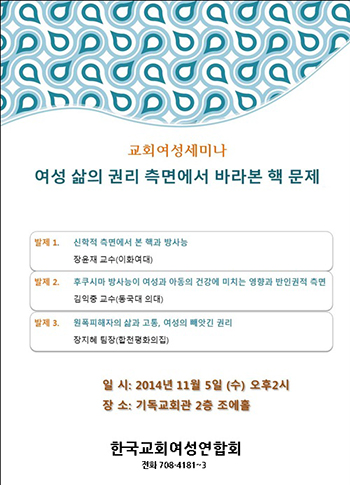 한국교회여성연합회는 오는 11월5일(수) 오후 서울 종로구 연지동 한국기독교회관 2층 조에홀에서 <교회여성세미나 - 여성 삶의 권리 측면에서 바라본 핵 문제>를 개최한다.
