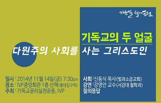 프란치스코 교황 방한, 아시안 게임에서 이슬람권 선수를 대상으로 한 지역교회 선교활동, 세월호 참사 등 굵직한 사회 현안에 대해 기독교 내부에서 갈등이 일고 있는 가운데 기독교윤리실천운동(기윤실)은 오는 11월14일(금) 오후 서울 마포구 IVF중앙회관에서 <기독교의 두 얼굴 - 다원주의 사회를 사는 그리스도인>이란 주제로 월례포럼을 연다.