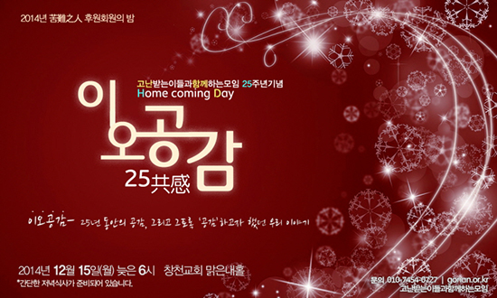 기독교 사회선교기관인 <고난 받는 이들과 함께하는 모임>(고난함께, 이사장 신경하 감독)은 오는 12월15일(월) 오후 서울 서대문구 창천동 창천교회(담임목사 구자경)에서 후원의 밤 행사를 연다. 특별히 이번 행사는 고난함께 창립 25주년 맞아 <이오공감>을 주제로 ‘홈커밍데이’로 진행된다.