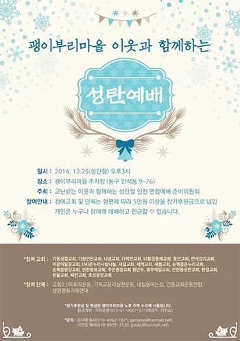<고난함께 인천 연합예배 준비위원회>(위원장 이진오 목사, 이하 준비위)는 인천 지역 내 교회연합 성탄기념예배를 12월25일 오후3시 인천 만석동 괭이부리마을 주차장에서 드리기로 결정했다. 이번 연합예배는 작은교회 목회자들이 만나 보수와 진보의 신학적 차이를 넘어 연합예배를 드리고 참가후원금과 헌금으로 고난 받는 이웃을 돕고자 기획되었으며 지난 4월 부활절 연합예배에 이어 올해로 두 번째이다.
