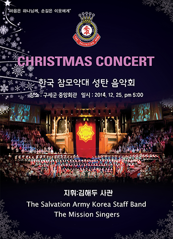 한국구세군(사령관 박종덕)은 오는 12월25일(목) 오후 5시 구세군 서울제일영문에서 참모악대 성탄음악회를 개최한다. 음악 전공자 및 전문가들로 이루어진 구세군 참모악대는 2006년 5월 창단한 브라스 밴드로 매년 크리스마스에 정기연주회를 열고 있다. 이번 참모악대 성탄음악회는 구세군 노래선교단, GSGQ 남성합창단이 협연한다.