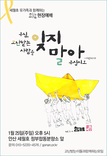 고난함께는 보도자료를 통해 “우리의 기도가 진실을 앞당길 것이며, 우리의 예배가 슬픔가운데 있는 유가족의 위로가 될 것이고, 우리의 행동을 통해 하나님의 뜻이 드러날 것”이라면서 “해를 넘겨 가면서도 진실규명을 위해 최선을 다하고 있는 유가족과 함께해주시길 부탁드린다”고 호소했다.
