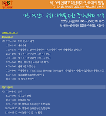한국조직신학회(회장 허호익)는 4월24일(금)-25일(토) 양일간 충북 영동군 추풍령면 지봉리 소재 단해교회에서 제10회 한국조직신학자 전국대회를 개최한다. 이번 대회의 주제는 “사회혁신과 교회개혁을 위한 조직신학의 모색”이다.