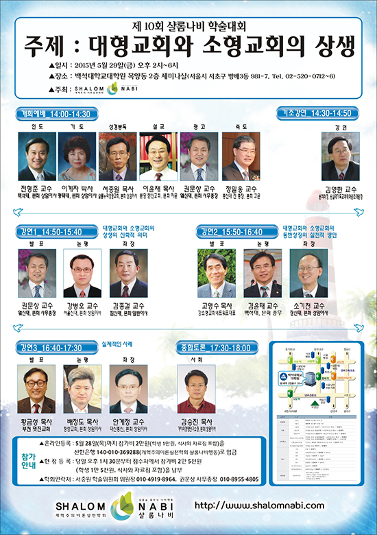 ‘샬롬을꿈꾸는나비행동’(상임대표 김영한 박사, 이하 샬롬나비)은 오는 5월29일(금) 오후 서울 서초구 방배동 백석대학교대학원 세미나실에서 <대형교회와 소형교회의 상생>을 주제로 제10회 학술대회를 개최한다.