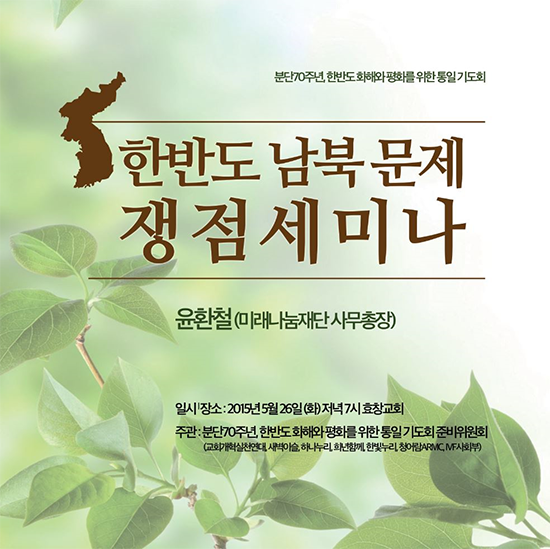 분단70주년, 한반도 화해와 평화를 위한 통일 기도회 준비위원회는 5월26일(화) 오후 7시 효창교회 4층(용산구 청파로47길 52 명신프라자)에서 <한반도 남북문제 쟁점 세미나>를 개최한다. 이 행사는 6월27일 임진각 평화누리에서 거행할 예정인 통일기도회에 앞서 무엇을 위해 기도할 것인지를 논의하기 위해 마련됐다. 세미나의 강사는 윤환철 미래나눔재단 사무총장이다.