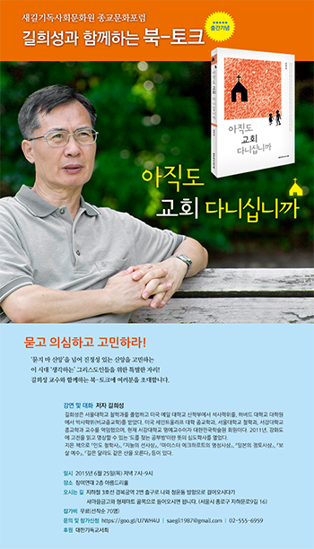 새길기독사회문화원(원장 정경일 박사)은 2015 종교문화포럼, “길희성 교수와 함께하는 북-토크”를 6월 25일(목) 저녁 7시에 참여연대 2층 아름드리홀 (서울시 종로구 자하문로9길 16)에서 개최한다. 이 포럼은 길희성 교수의 저서 『아직도 교회 다니십니까』의 출간 기념으로 기획되었다. 대한기독교서회 후원으로 열리는 이 행사의 관계자는 포럼이 “‘묻지마 신앙’ 넘어 진정성 있는 신앙을 고민하는 이 시대 ‘생각하는’ 그리스도인들을 위한 특별한 자리”라고 소개했다.