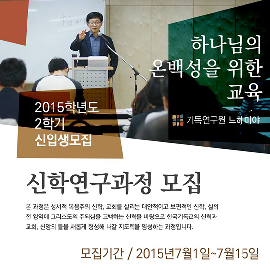 기독연구원 느헤미야는 오는 7월1일(수)부터 18일(수)까지 2015학년도 신학연구과정 2학기 신입생을 모집한다.