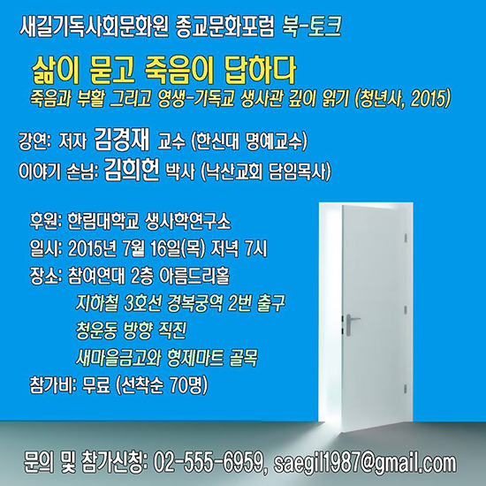 새길기독사회문화원(원장 정경일 박사)은 오는 7월16일(목) 오후 7시 서울 종로구 자하문로 참여연대에서 종교문화 포럼 “김경재 교수와 함께하는 북토크” 행사를 연다.