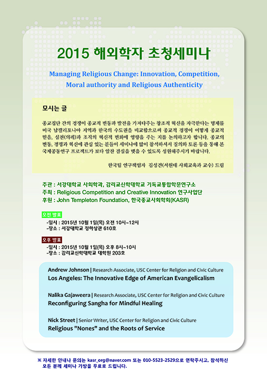 감리교신학대학교 기독교통합학문연구소는 서강대학교 사회학과와 공동으로 10월1일(목) 서강대학교(오전 10시부터)와 감리교신학대학교(오후 8시부터)에서 <2015 해외학자 초청세미나>를 개최한다. 주제는 “Managing Religious Change: Innovation, Competition, Moral Authority and Religious Authenticity”이며 미국 남캘리포니아 대학교 종교및사회문화연구소 연구원들이 발표한다.