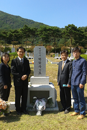 | ▲애국지사 박학수의 묘 앞에서 기념 촬영을 하고 있는 한신대총동문회 주요 관계자들. ⓒ사진제공= 한신대총동문회 |