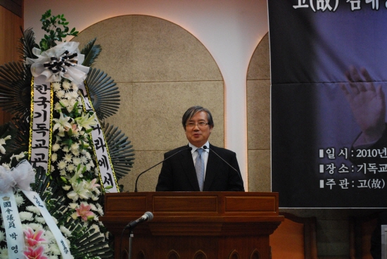 | ▲ 추모사를 전하고 있는 한신대 채수일 총장. 채 총장은 오만한 권력에 의해 역사가 거꾸로 가고 있다며 '되찾아야 할 10년'을 위해 故 김대중 대통령을 따라 다시 일어나 행동하는 양심이 될 것을 촉구했다 ⓒ김태양 기자 |