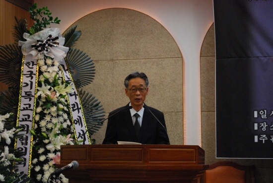 말씀을 전한 신경하 기감 전 감독은 일본 납치 당시 고인이 수장될 뻔한 위기 가운데 예수를 만났다며, 그가 숱한 고난과 실패, 환란과 역경을 참고 이겨낼 수 있었던 이유는 이러한 하나님의 때와 징조에 대한 믿음을 잃지 않았던 예언자적 능력 때문이었다고 설명했다. 하나님의 계획은 사람의 생각과 다를 수 있기에 겸허하게 그분께서 정하신 때를 기다리는 가운데 고난의 삶을 감내해야 한다는 요지다. 신 전 감독은 고인이 세상의 빛이 되라는 예수님의 말씀처럼 스스로 몸을 살라 민족의 어둠을 밝혔다고 말했다.