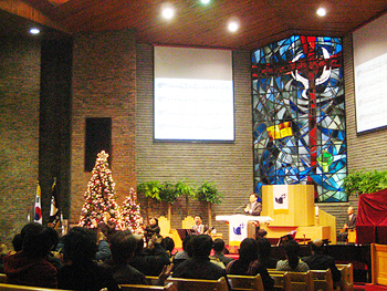 서울 연지동 연동교회(이성희 목사)는 매주 수요일 오후 12시 직장인들을 위한 예배를 드리고 있다. 2008년의 마지막 날인 31일 오후 12시에는 예배를 알리는 종소리가 울리자 2백여 명이 예배에 참석했다.