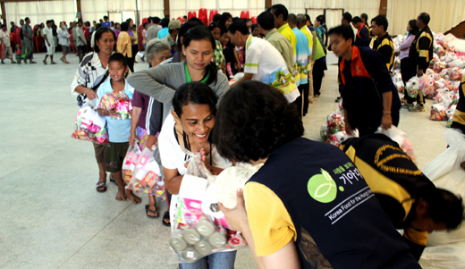 10월 31일 긴급구호팀을 현장에 파견, 11월 2일 태국 현지 상황을 둘러보고 빠툼타니 지역 1천5백여 가구에 물, 통조림, 화장지 등의 물품을 지원 했다. 빠툼타니는 방콕의 북쪽에 위치한 도시로 이번 홍수로 공장들이 모두 물에 잠기는 등 극심한 피해를 입은 지역이다.