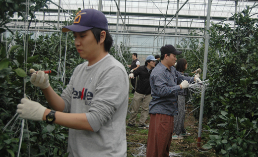| ▲우리는 마을 주민의 딸기밭에서 딸기넝쿨을 손질했으며 귤밭에 가서는 감귤나무를 매달아 놓은 끈들을 제거하는 일 등의 대민지원을 하였고, 가로막은 철조망을 넘어 들어가 구럼비 바위를 만져보며 일출에 감격하였다. ⓒ베리타스 DB |