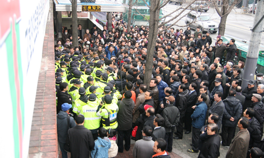 | ▲27일 오전 1부 주일예배시 강북제일교회 황형택 목사 지지측 교인들이 교회 진입을 시도하자 경찰들이 막아서고 있다. ⓒ베리타스 |