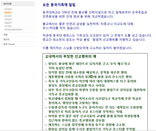 동국대 내 법회 운영과 불교 강좌 마련 등을 담당해 온 정각원은 29일 교내 홈페이지 공지글에 캠퍼스 내 선교 활동을 벌이는 이들 개신교 신자들과 관련해 "종교간 최소한의 금도는 커녕 불법·탈법적 선교행위를 자행하고 있다"고 비판했다.