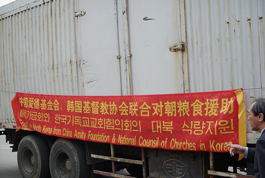 | ▲지난 5월 한국기독교교회협의회(NCCK)가 중국 단둥에서 중국 기독교 단체인 '애덕 기금회'를 통해 북한에 밀가루 지원하는 모습. ⓒ베리타스 DB |