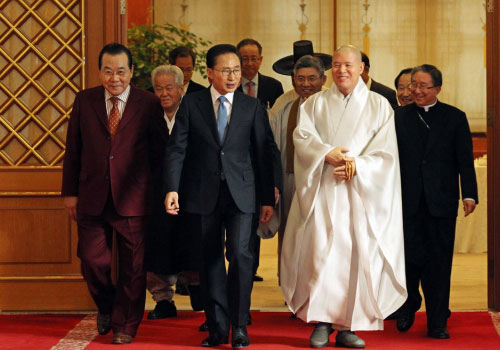 | ▲이명박 대통령이 21일 오후 7대 종단 지도자들을 청와대로 초청, 북한 상황을 설명한 후 인왕실로 이동하고 있다. ⓒ청와대 |