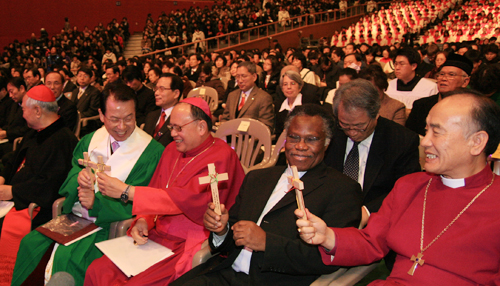 | 18일 오후 4시 서울 올림픽공원 올림픽홀에서 열린 그리스도인 일치 기도회에서 각 교회 대표들이 ‘일치 나무 십자가’를 들고 개신교, 천주교, 정교회의 하나됨을 표현하고 있다. 오른쪽부터 대한성공회 박경조 주교, WCC 사무엘 코비아 총무, 주한 교황대사 오스발도 파딜랴, NCCK 김삼환 회장, 한국 천주교 서울대교구장 정진석 추기경. |