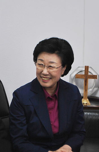 | ▲민주통합당 한명숙 대표가 NCCK 김영주 총무와 환담을 나누던 중 환하게 웃고 있다. ⓒ베리타스 |