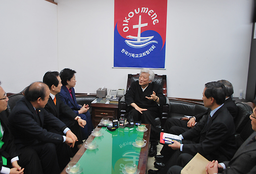 민주통합당 한명숙 대표가 30일 오후 서울 연지동 기독교회관에 소재한 한국기독교교회협의회(이하 NCCK)를 방문, 총무실에서 김영주 총무와 환담을 나눴다.