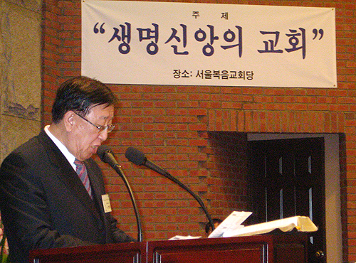 | 전병호 기독교대한복음교회 총회장은 고 최태용 목사의 전집이 널리 읽혀져 한국교회가 올바른 복음을 추구할 수 있기를 기원했다.ⓒ박종배 기자 |