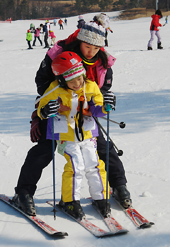 | ▲한신대더불어 스키캠프에 참가한 장애아동이 자원봉사자의 도움을 받아 스키를 타고 있다. |