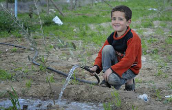 | ▲가자지구 난민캠프에서 지내고 있는 5살난 팔레스타인 소년 모하마드 알샤위시가 나무에 물을 주고 있다. 가자지구에서 물의 3분의 2는 농사를 위해 사용된다. 그러나 농부들은 허가 없이 얕은 우물에서 물을 길러 사용하곤 하는데 짜거나 오염된 경우가 많다고 한다. ⓒWCC 제공 |
