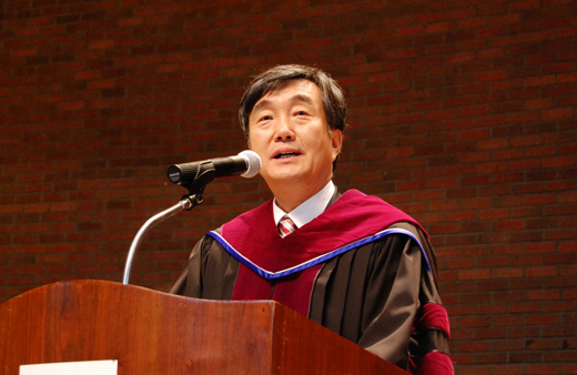| ▲한신대 채수일 총장이 2012년도 입학식에서 인사말을 전하고 있다. |