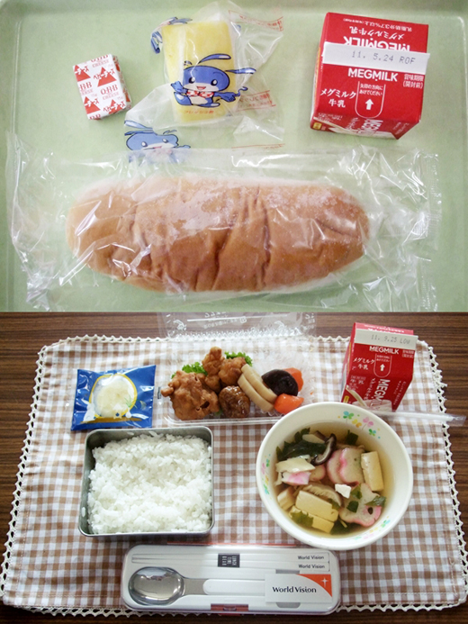 | ▲쓰나미로 급식센터가 쓸려가 급식이 제대로 이루어지지 않았다.(위) 월드비전은 급식센터를 복구하고 전문 영양사의 도움을 받아 영양이 골고루 갖추어진 급식을 아이들에게 제공한다(아래). |