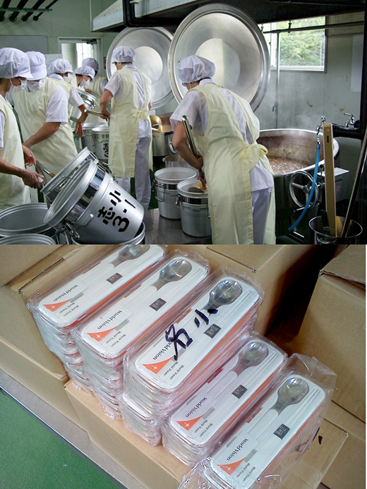 | ▲월드비전이 지원한 급식센터에서 조리를 하는 모습(위), 월드비전 지원 수저. 젓가락 통(아래). |