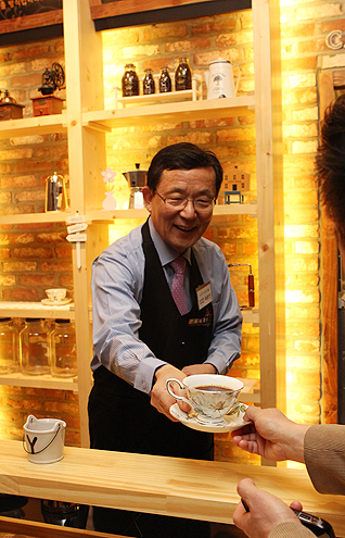 | ▲최중언 분당차병원 명예원장이 미혼모가정 지원 기금 마련을 위한 ‘기부데이’ 행사에서 커피를 직접 만들며 일일 봉사활동을 하고 있다. |
