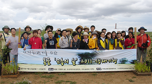 | ▲2011년 몽골 ‘은총의 숲’ 생태기행에 참여한 참가자들이 기념사진을 촬영하고 있다. ⓒ기환연 제공 |