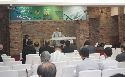 | ▲18일 오후 2시 한국교회백주년기념관 소강당에서 제13회 기독교학술원 영성포럼이 열렸다. 1부 예배 순서 중 한신대 이장식 박사가 설교하고 있다. ⓒ베리타스 |