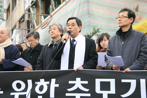 22일 오전 11시 서울 용산 재개발지역 철거 현장의 임시분향소 앞에서 ‘용산 철거지구 희생자를 위한 추모기도회’가 드려졌다. 이날 기도회에는 한국기독교교회협의회 정의평화위원회 등 15개 기독교단체에서 50여명 회원들이 참석했다. 이들은 사건의 진상 규명과 이명박 대통령의 사과, 김석기 서울경찰청장의 사법적 책임을 요구했다.