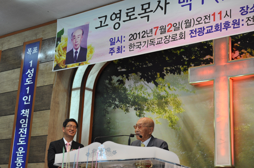한국기독교장로회(이하 기장) 제38회 호헌 총회의 유일한 생존자로서 한국교회의 산 증인인 고영로 원로목사 백수감사예배가 2일 오전 11시 전주 전광교회(담임 오태일 목사)에서 열렸다.