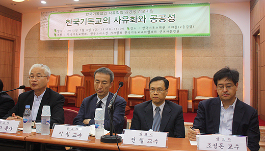 6일 오후 1시 기독교회관 2층 조에홀에서 ‘한국기독교에 나타난 사유화 문제와 공공성 회복’을 주제로 한 심포지움이 열렸다. 한국기독교교회협의회 선교훈련원과 한국기독교학회 등이 공동주최한 이날 심포지움에서는 채수일 한신대 총장의 환영사에 이어 정성진 목사(거룩한빛광성교회), 이철 교수(숭실대), 전철 교수(한신대), 조성돈 교수(실천신학대학원) 등이 각각 목회학적으로, 종교사회학적으로, 조직신학적으로, 신학적대안으로 를 주제로 발제했다.