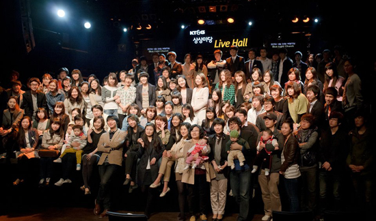 | ▲홍대 상상마당 라이브홀에서 예배 후 기념촬영을 하고 있는 블루라이트교회 성도들. ⓒ불루라이트교회 제공 |