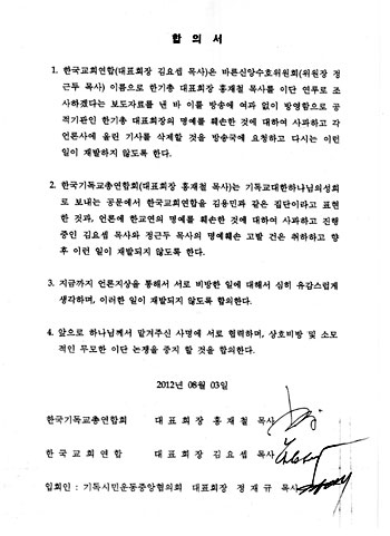 지난 6일 공개된 합의서에서 한기총은 "기독교대한하나님의성회로 보내는 공문에서 한국교회연합을 김용민과 같은 집단이라고 표현한 것과, 언론에 한교연의 명예를 훼손한 것에 대하여 사과하고 진행 중인 김요셉 목사와 정근두 목사의 명예훼손 고발 건은 취하하고 향후 이런 일이 재발되지 않도록 한다"고 했다.