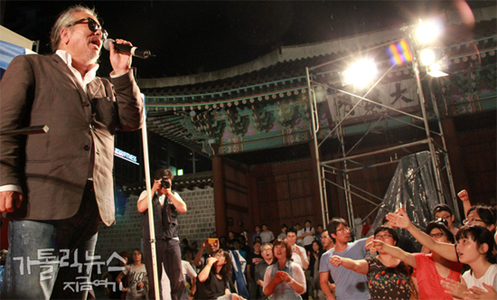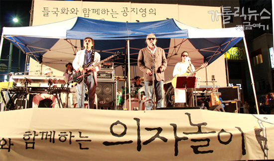 무더위와 소나기 등 짖궃은 날씨에도 불구, 많은 인파들이 모여 북새통을 이룬 대한문 앞에서는 공 작가의 ‘의자놀이’를 축하하기 위해 락밴드 들국화가 찾아 흥을 돋궜다.