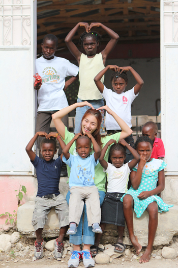 | ▲ 김정화 기아대책 홍보대사가 아이티 간시에 지역 교회 아이들과 하트 모양을 그리고 있다. ⓒ기아대책 제공 |