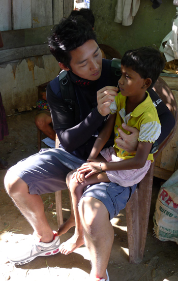 | ▲배우 이태성이 쓰나미 난민 어린이에게 약을 발라주고 있다 ⓒ기아대책 제공 |