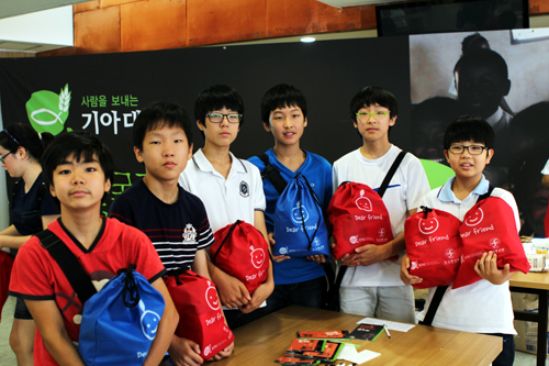 | ▲직접 만든 식량키트를 들고 웃는 성락성결교회 학생들 ⓒ기아대책 제공 |