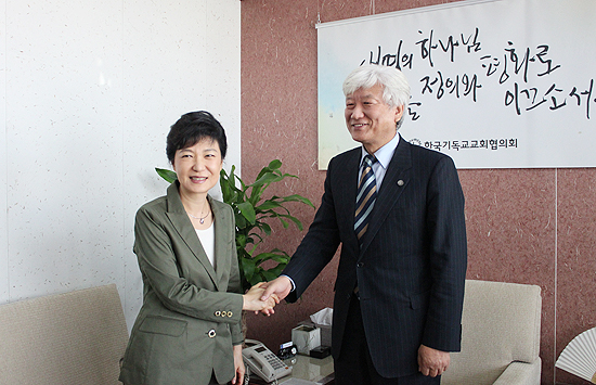 박근혜 새누리당 대선 후보가 10일 한국기독교교회협의회(이하 교회협) 김영주 총무를 예방, 사회 통합에 대한 의견을 나눴다.
