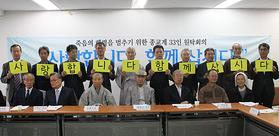 | ▲죽음의 행렬을 멈추기 위한 종교계 33인 원탁회의를 마친 종교인들이 ‘사랑합니다. 함께 삽시다’란 피켓을 들고 기념촬영을 하고 있다. ⓒ교회협 제공 |