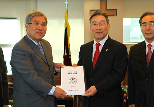 | ▲권오서 장개위원장(좌)이 4인의 서명을 받은 개정법률을 김기택 임시감독회장(우)에게 전달하고 있다. ⓒ당당뉴스 제공 |